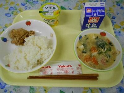 ごはん、鶏肉の唐揚げ、かき玉汁、ヨーグルト、牛乳