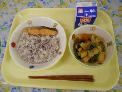 ゆかりごはん、サケの塩焼き、五目煮、牛乳