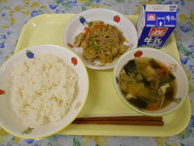 ごはん、ホイコーロー、わかめスープ、牛乳