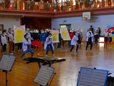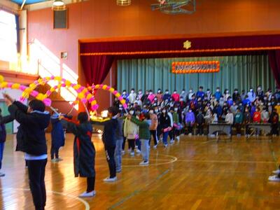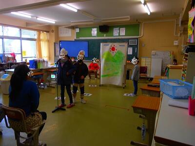 開会式の後各学年からの発表が始まりました。最初は4年生の発表です。4年生はポケモンの歌に合わせながら6年生への感謝の気持ち等を伝えました。