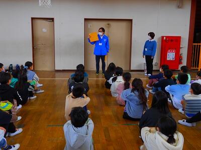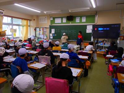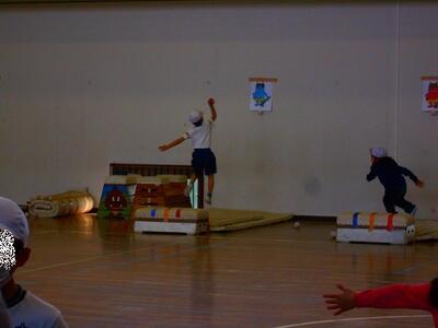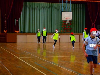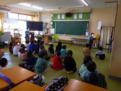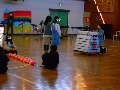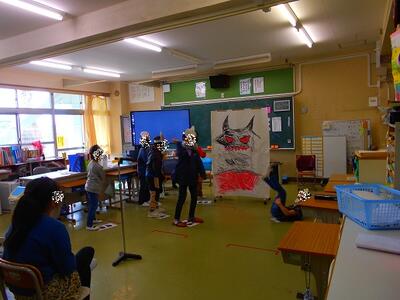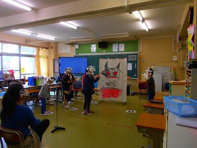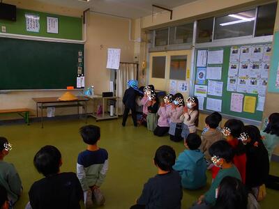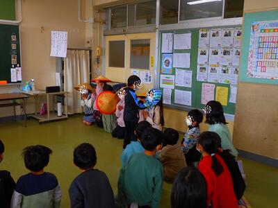 1組の児童が桃太郎の劇を作り、たくさん練習して2組のお兄さん、お姉さんに見てもらいました。元気いっぱいの演技に大きな拍手をもらいました。