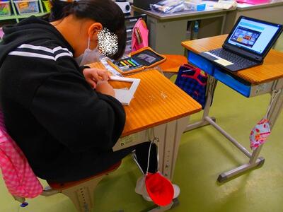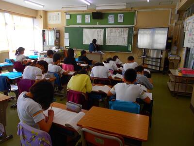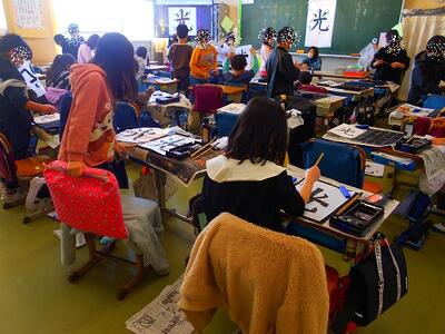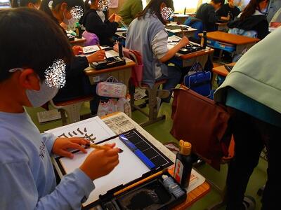 書写の授業。1,2年生は硬筆、3年生以上は毛筆に挑戦です。