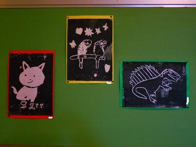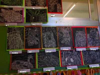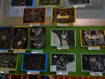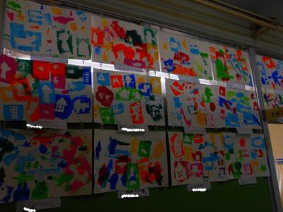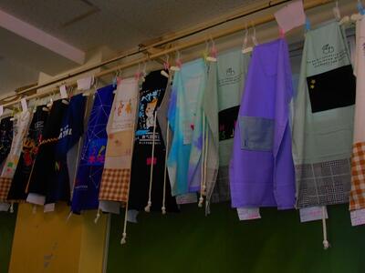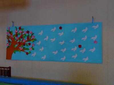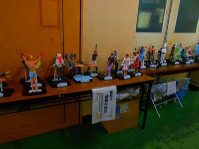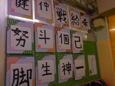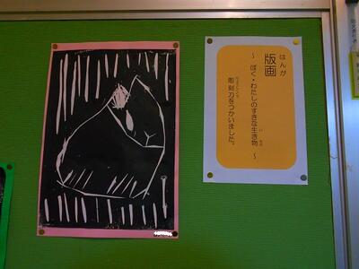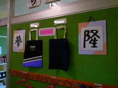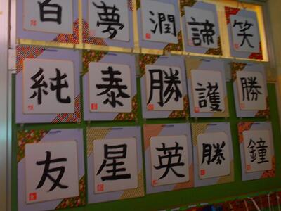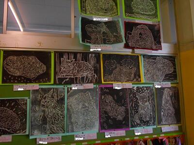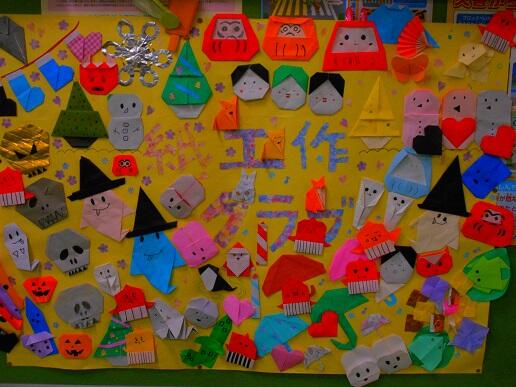 紙工作クラブが職員室前に、クラブで作った作品を展示しています。