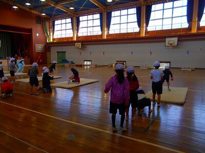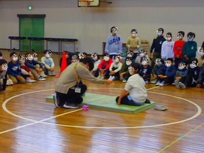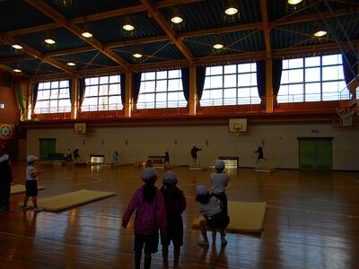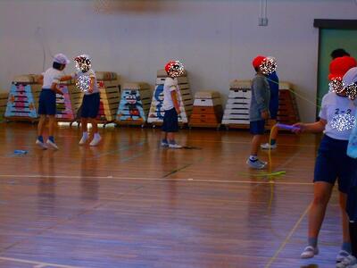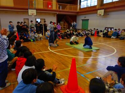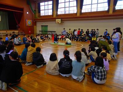 4年生の発表が終わるとすぐに退場し、入れ替わりに2年生が入場してきました。2年生は果敢にも6年生に「縄跳び」「図工作品」「鍵盤ハーモニカ」などで勝負を挑みますが、ことごとく6年生のパワーに圧倒され、改めて6年生のすごさを実感できる発表を行いました。