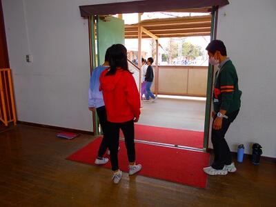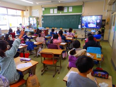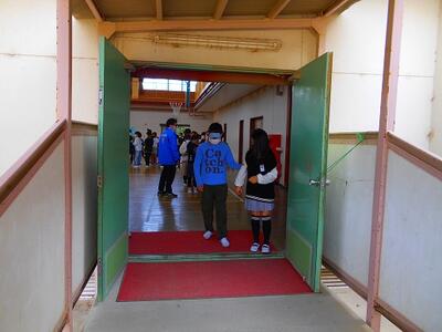 4年生が花のアーチを作る中、6年生が入場してきます。教室にいる児童にはリモートで生中継を行っています。