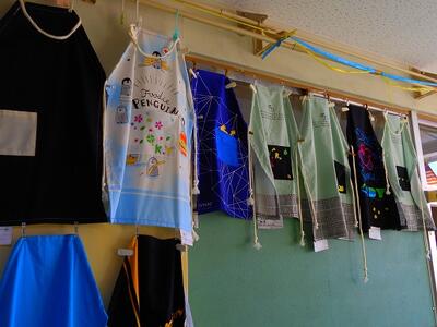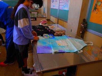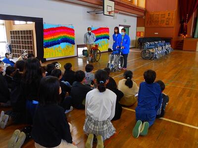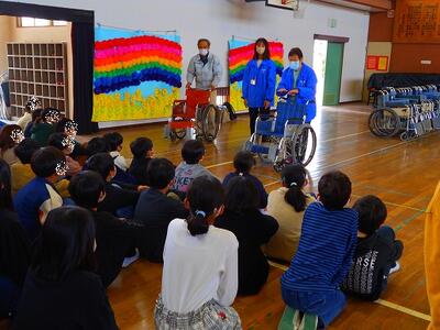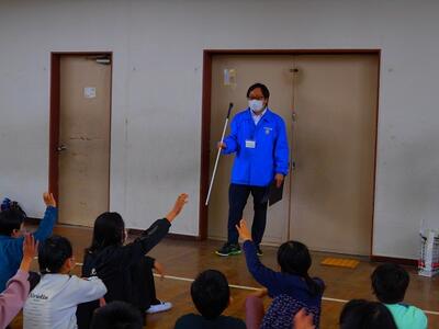 そのあと2グループに分かれて、それぞれがブラインドマスクと車いすについてお話を聞きました。目が見えない方にとって大切なアイテムとして、白杖や点字ブロックがあることを学びました。