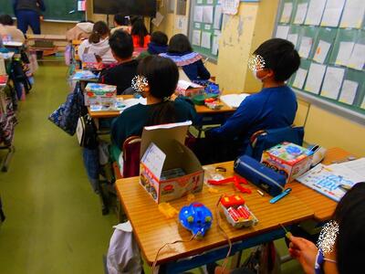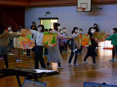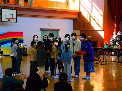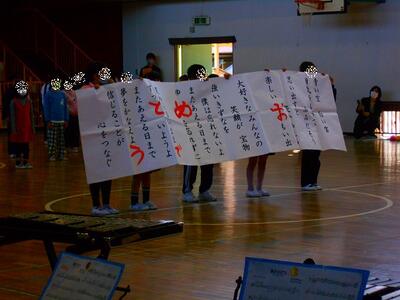 最後に1~3年生が気持ちを込めて作ったプレゼントを、代表して1年生が6年生に贈りました。