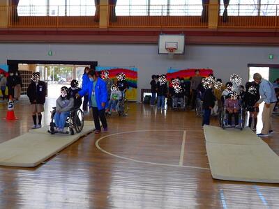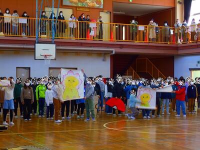 3年生の次は6年生に一番お世話になった1年生の登場です。アンパンマンの歌に合わせて6年生への思いを伝えました。6年生もペアの子の顔を見ながら微笑んでいました。