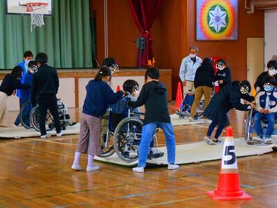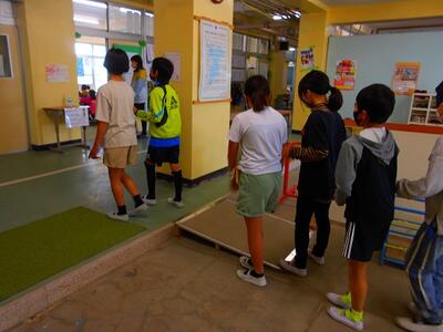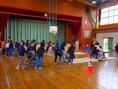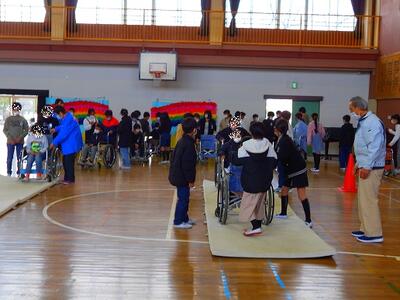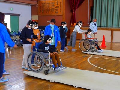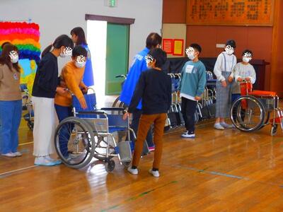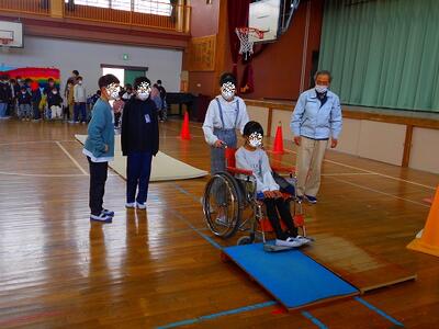 ブラインドマスクチームと車いすチームが交替し、一通りどちらも体験しました。どちらも、ただ手を引けばよいものではなく、また、力いっぱい押せばいいものではないことを身をもって体験しました。一番大切なことは「相手の気持ちになって」お手伝いをすること。ではないでしょうか。