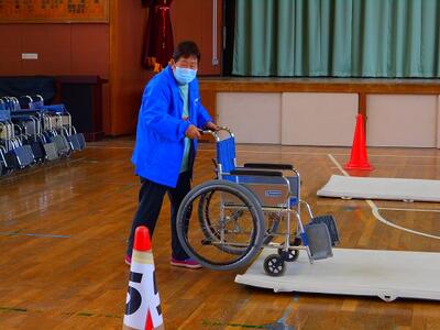 一方の車いすチームのほうは、最初車いすの組み立て方やたたみ方を教えてもらい、そのあと、押すときのコツなどを見せていただきました。