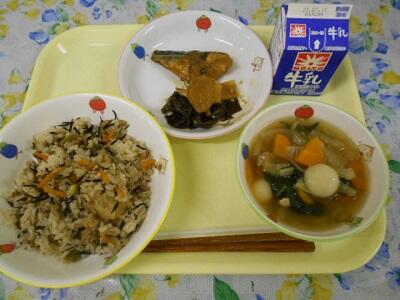 ひじきごはん、サバの味噌煮、白玉汁、牛乳
