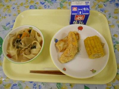 ほうとう、天ぷら(ちくわ、かぼちゃ、)、ゆでとうもろこし、牛乳
