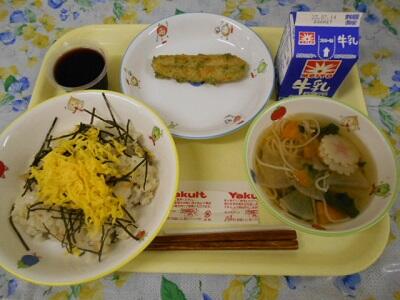 五目ちらし寿司、笹かまぼこの磯部揚げ、そうめん汁、ぶどうゼリー、牛乳