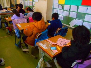 百人一首の練習も始まりました。まずは、カードを切り分けます。