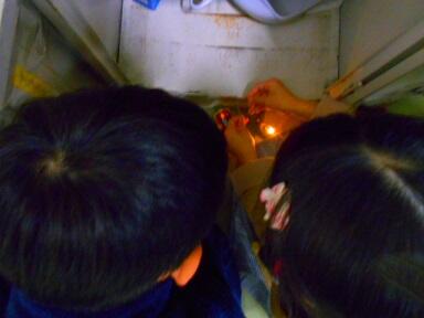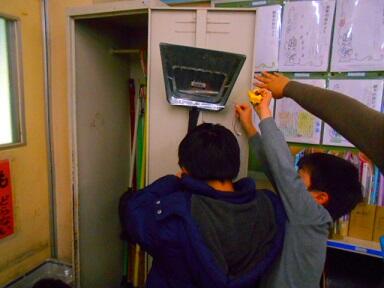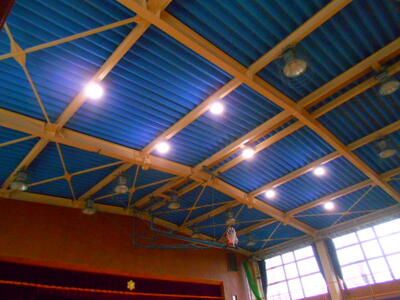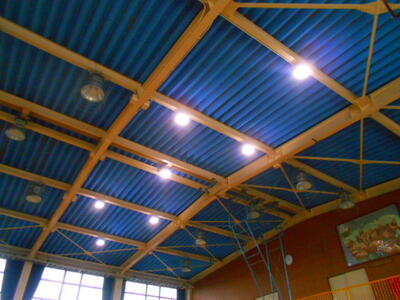 2月3日(土)に停電の仮復旧工事を行っていただき、校舎の西側半分が24時間通電可能となりました。この工事は、東門側道路にある電柱より直接校舎に電気を引き込むもので、20Kw分(100A)の電力を供給していただけるようになりました。結果として、発電機の容量に余裕が生まれたため、体育館の照明に電力を回すことに成功しました。体育館の照明も全てではありませんが、一部をLED照明に交換してもらい、明るい中で学習ができるようになりました。