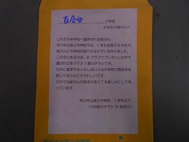 6年生は昨日、4月からお世話になる第三中学校を訪問し、中学校とはどんなところなのかを見せていただきました。本来であれば、授業の見学の後に生徒会本部の生徒さんから、いろいろと詳しくお話を伺い、部活動の見学も予定していましたが、思いもかけない雪の影響で部活動も中止となり、授業の見学のみとなりました。しかしながら、中学生が小学生のために分かりやすいチラシを作成してくれましたので、みんなで読みたいと思います。