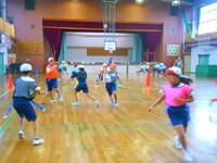 各学級5チームに分かれて「タグ取りゲーム」とラグビーボールを使った「ボール運びゲーム」を行いました。
