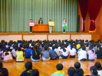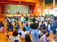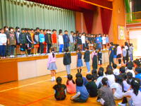 区切りの式の後は、陸上部壮行会でした。42名の部員がステージに上がり、全校児童からたくさんの応援を受けました。陸上大会は10月25日(金)に国府台スポーツセンターで行われます。大会に向けて、陸上部のみなさん頑張ってください。